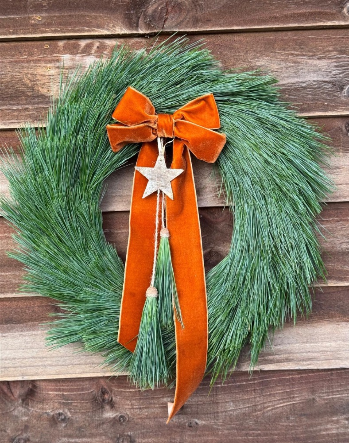 Handcrafted on a sustainably-sourced moss base, hand-bound onto a natural frame, Wild Pine showcases long-needle evergreens arranged for soft movement and texture. A warm burnt-orange velvet bow drapes elegantly, finished with handmade pine needle tassels that add a beautifully tactile, foraged detail. The simple birch star accent completes this woodland-inspired design.